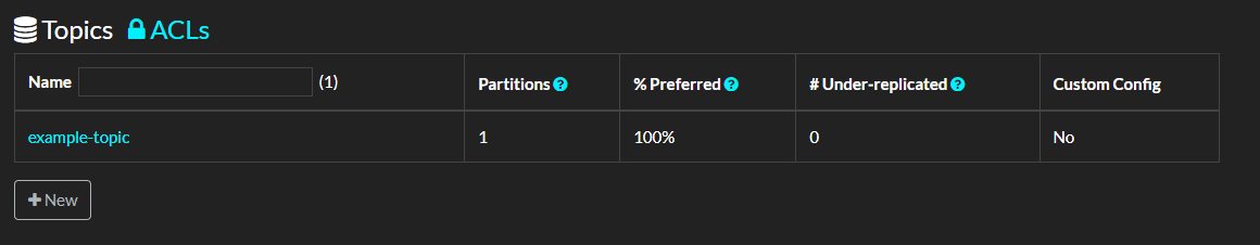 위 코드를 실행하면 아래처럼 example-topic 이 생성된걸 확인할 수 있다.