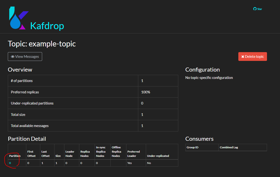 example-topic 을 눌러서 들어가면 아래의 화면이 나온다. 파티션 0번을 들어가보자.